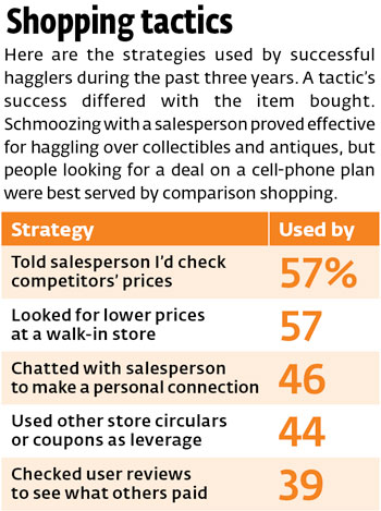 Hate to haggle? You’re not alone. Our new national survey found that just 48 percent of shoppers tried bargaining for a better deal on everyday goods and services in the past three years, down from 61 percent in 2007. But if you’re chicken, you lose. Eighty-nine percent of those who haggled were rewarded at least once. Successful furniture hagglers saved $300 on average, as did those who questioned a health-related charge. Those who challenged their cell-phone plans saved $80.