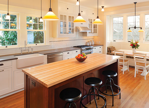 A centrally placed ceiling fixture or recessed lights usually provide general lighting here, supplemented by under cabinet lighting for tasks. A fixture or two over the island and the table boost general lighting, and dimming lets you switch moods and move from homework to dining. If you have recessed lighting, the color of the can’s interior, which surrounds the bulb, affects light output and light color. A shiny metal reflector casts the most light but increases glare. A black interior reduces glare but absorbs light, so you might need a brighter bulb.